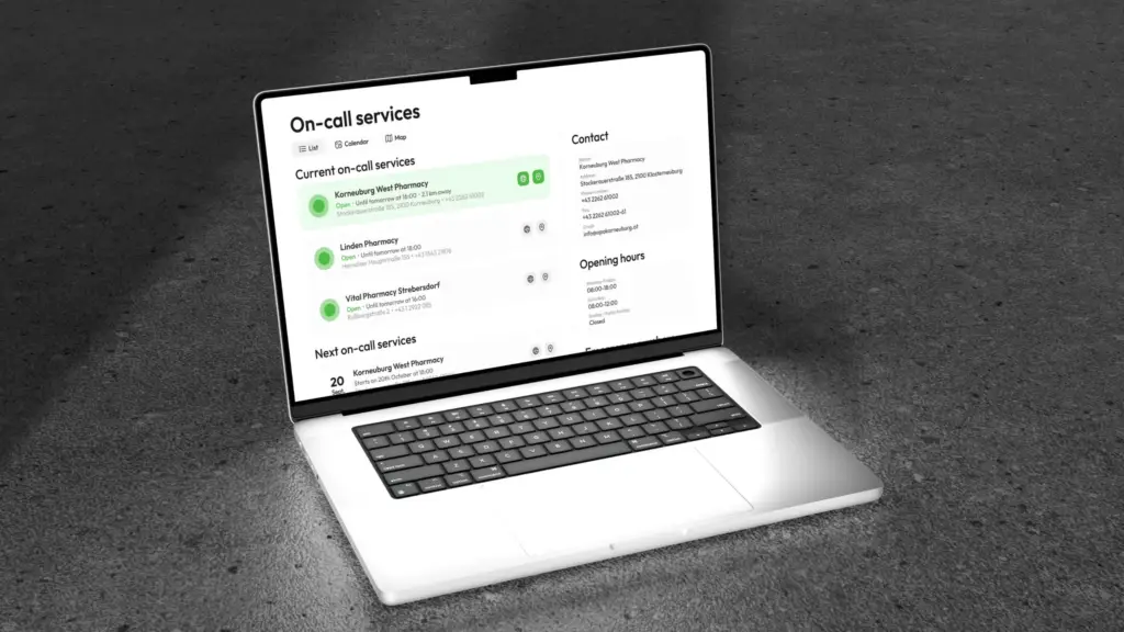 Our deliverables included UX and UI design for the central platform, list, calendar, and map views, detailed contact displays, and a lightweight widget that pharmacies can integrate to show live status and contact information.